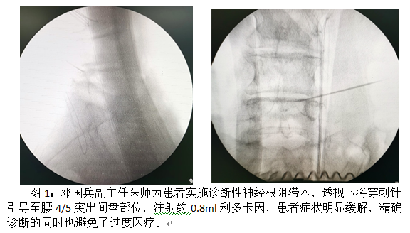 考慮患者年齡較大,腰椎退變嚴重,影像學檢查提示多節(jié)段腰椎間盤突出,房佐忠主任醫(yī)師、鄧國兵副主任醫(yī)師對患者進行仔細查體,考慮癥狀為腰4/5突出壓迫神經(jīng)根所致可能性大,為進一步明確診斷,于8月19日行診斷性“椎管內(nèi)神經(jīng)根阻滯術(shù)”,手術(shù)由微創(chuàng)內(nèi)鏡診療組組長鄧國兵副主任醫(yī)師實施,歷時僅數(shù)分鐘,術(shù)后左臀部及下肢疼痛緩解約90%,患者即刻能挺直腰桿站立,能在手術(shù)室行走自如。