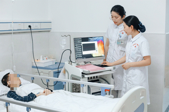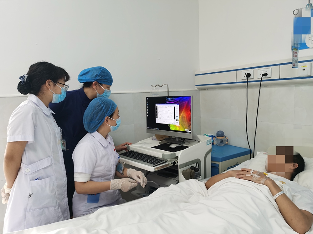 圖為王媛媛老師在康復(fù)病房進(jìn)行尿壓監(jiān)測(cè)
