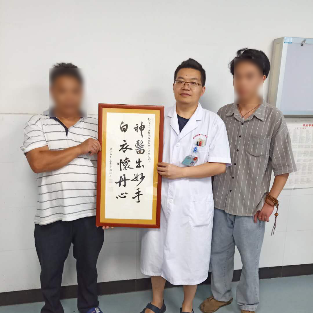 8月27日一大早,51歲的尹女士愛(ài)人及兒子激動(dòng)地來(lái)到郴州市第一民醫(yī)院神經(jīng)外科一區(qū)醫(yī)生辦公室,親手將一副已鑲好的字畫送到葉友忠主任醫(yī)師手上,上面寫著“神醫(yī)出妙手 白衣懷丹心”八字氣勢(shì)磅礴的大字,以表示對(duì)神經(jīng)外科一區(qū)團(tuán)隊(duì)的感謝,并為他們專業(yè)、專注的工作態(tài)度和耐心點(diǎn)贊:“感謝你們給了我第二次生命,有你們真好!”