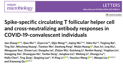 新冠疫情爆發(fā)以來,我院轉(zhuǎn)化醫(yī)學(xué)研究所瞿小旺、劉文培博士帶領(lǐng)團(tuán)隊(duì)成員加班加點(diǎn),積極開展新冠中和抗體和t細(xì)胞免疫相關(guān)的前沿科技攻關(guān)。在邵陽市中心醫(yī)院、中山大學(xué)、中國(guó)食品藥品檢定研究院的通力合作下于2020年11月16日,在國(guó)際頂級(jí)期刊上《nature microbiology》(影響因子:15.540)發(fā)表題為《spike-specific circulating t follicular helper cell cross-neutralizing antibody responses in covid-19-convalescent individuals》的新冠研究論文。