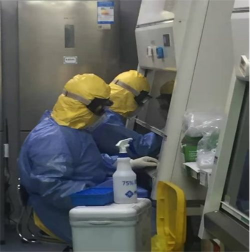 研究團(tuán)隊(duì)成員張健助理研究員(左)與胡雅彬博士(右)全副武裝在生物2級(jí)實(shí)驗(yàn)室(p2)處理新冠康復(fù)者血樣
