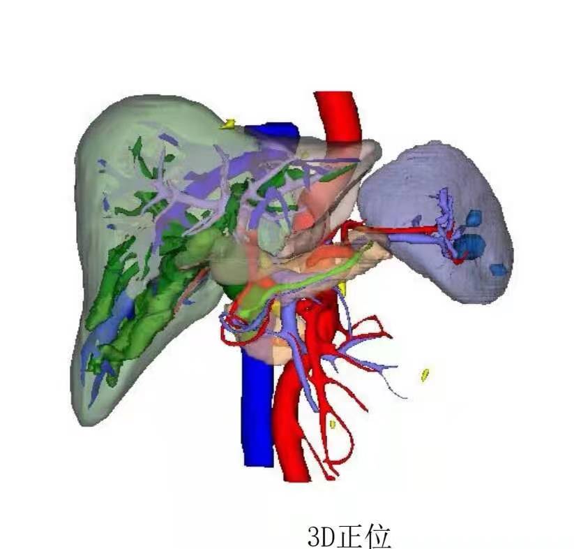 該病人為老年女性,因反復(fù)上腹部脹痛一月余入院,十余年前曾因肝內(nèi)外膽管結(jié)石在當(dāng)?shù)蒯t(yī)院行開腹膽總管切開取石膽囊切除術(shù),腹部留下了巨大的切口疤痕。此次患者肝內(nèi)膽管結(jié)石再次復(fù)發(fā),致使患者反復(fù)腹痛出現(xiàn)膽管炎,在當(dāng)?shù)蒯t(yī)院就醫(yī)檢查,提示為肝內(nèi)多發(fā)結(jié)石,需再次開腹手術(shù),但手術(shù)難度大風(fēng)險(xiǎn)極高,患者及家屬遂慕名來我院就診。入住我院后,經(jīng)完善相關(guān)檢查,提示為肝內(nèi)多發(fā)結(jié)石并肝內(nèi)膽管擴(kuò)張,其結(jié)石主要位于右肝,但肝臟無明顯肝纖維化及萎縮表現(xiàn)。常規(guī)手術(shù)方案需行再次膽總管切開取石右肝部分切除術(shù),手術(shù)時(shí)長估計(jì)要4-5小時(shí)以上,且存在大出血風(fēng)險(xiǎn),手術(shù)時(shí)間長創(chuàng)傷極大風(fēng)險(xiǎn)極高,且患者年齡高,一般情況欠佳,患者及家屬均擔(dān)心患者難以耐受手術(shù)。后經(jīng)肝膽外科科主任謝敖文主任醫(yī)師多次組織討論,利用我院3d打印中心3d成像技術(shù)明確患者肝內(nèi)結(jié)石及血管情況,認(rèn)為可行經(jīng)皮肝穿刺一期膽管取石術(shù),該手術(shù)方法創(chuàng)傷極小、相對安全,且不用切除患者部分肝臟便能盡可能取盡結(jié)石,最大程度保肝護(hù)肝。