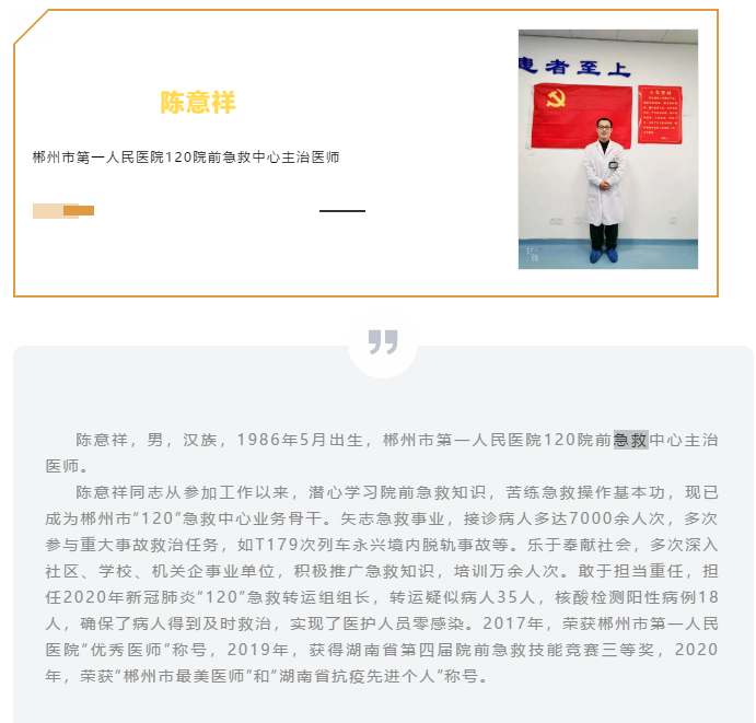 陳意祥,男,漢族,1986年5月出生,郴州市第一人民醫(yī)院120院前急救中心主治醫(yī)師。