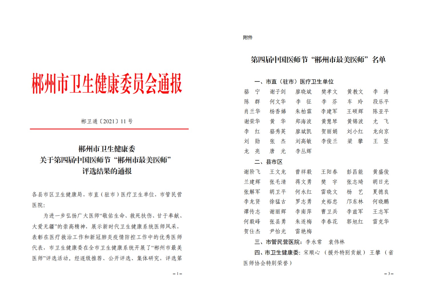 8月19日,市衛(wèi)健委發(fā)布,經(jīng)過廣泛動員、組織推薦、遴選考察等,郴州市第一人民醫(yī)院駱寧、謝子劍、廖曉斌、樊孝文、黃教文、李濤、陳群、何文華、李征、李芬、車玲、段樂平、肖蘭華、楊香娣、朱柏霖、宋順心、王攀等17名醫(yī)生獲得2021年“郴州市最美醫(yī)生”稱號。