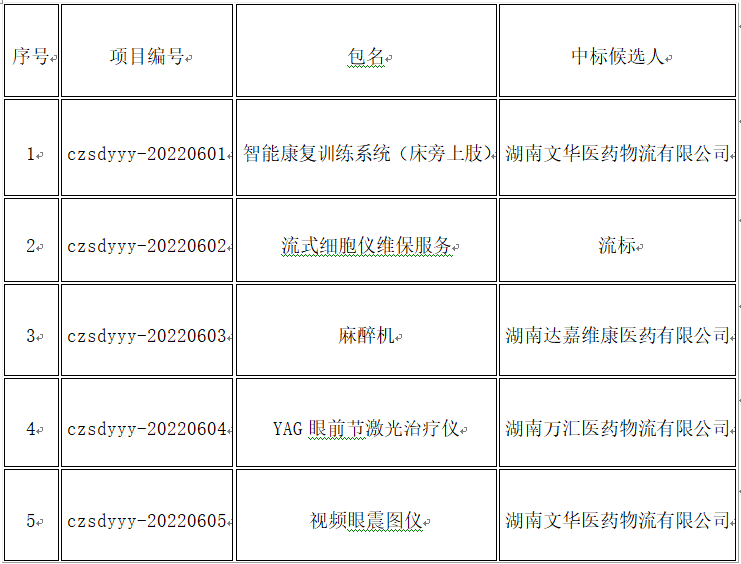 郴州市第一人民醫(yī)院2022年第四批采購(gòu)項(xiàng)目,評(píng)標(biāo)委員會(huì)于2022年6月24日在郴州市第一人民醫(yī)院進(jìn)行了評(píng)標(biāo)。評(píng)標(biāo)委員會(huì)按照招標(biāo)文件規(guī)定的評(píng)標(biāo)辦法進(jìn)行評(píng)審,推薦中標(biāo)候選人如下: