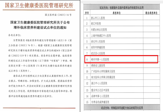 2月7日,國(guó)家衛(wèi)生健康委醫(yī)院管理研究所公布增補(bǔ)臨床營(yíng)養(yǎng)科建設(shè)試點(diǎn)單位的通知,郴州市第一人民醫(yī)院(試點(diǎn)方向:創(chuàng)新腸外及腸內(nèi)營(yíng)養(yǎng)治療的規(guī)范化應(yīng)用)成功入圍,成為國(guó)家臨床營(yíng)養(yǎng)科建設(shè)試點(diǎn)單位。