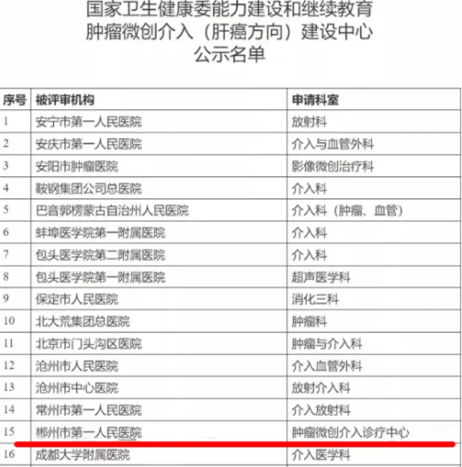 近日,國家衛(wèi)生健康委能力建設(shè)與繼續(xù)教育中心公布了關(guān)于國家首批腫瘤微創(chuàng)介入(肝癌、肺癌方向)建設(shè)中心遴選醫(yī)院名單。郴州市第一人民醫(yī)院腫瘤微創(chuàng)介入診療中心經(jīng)過候選單位基本條件評(píng)估、初審答辯評(píng)分、專家委員會(huì)綜合評(píng)估三個(gè)階段,在全國1291家符合資質(zhì)的申報(bào)單位中順利通過遴選,入選“腫瘤微創(chuàng)介入(肝癌方向)建設(shè)中心”。