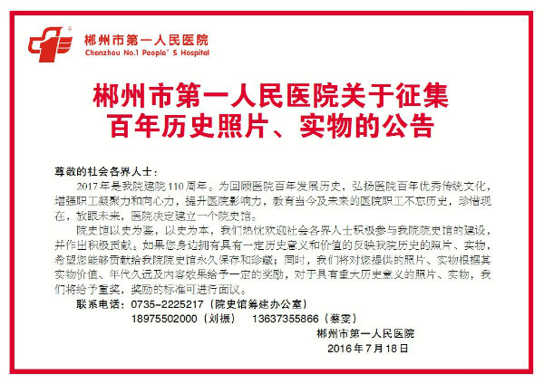 關(guān)于征集郴州市第一人民醫(yī)院百年歷史照片、實(shí)物的公告