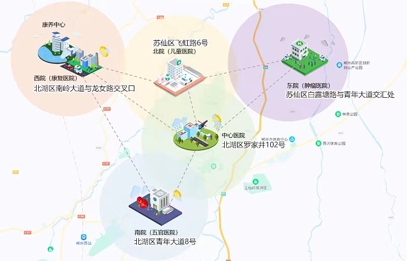 郴州市第一人民醫(yī)院共分為東、南、西、北、中五個院區(qū),和一個康養(yǎng)中心,簡稱為“一體四輪一中心”。