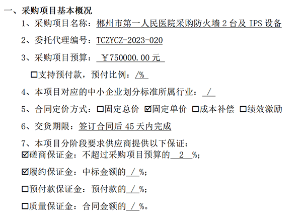 郴州市第一人民醫(yī)院采購(gòu)防火墻2臺(tái)及ips設(shè)備 |