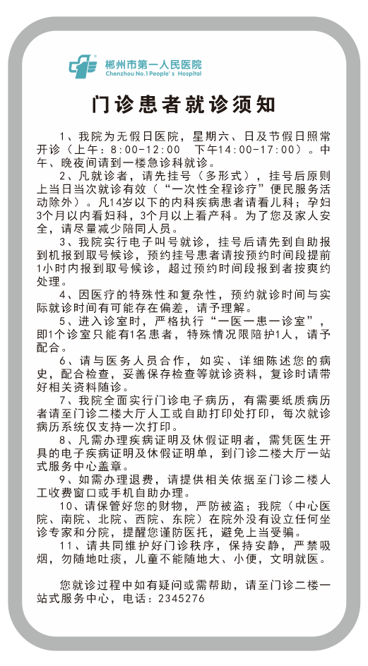 中心醫(yī)院地址:郴州市羅家井102號 電話:(0735)2343666(工作時間) (0735)2343999(非工作時間) 南院醫(yī)院地址:郴州市青年大道8號 電話:(0735)2379888 北院(兒童醫(yī)院)地址:郴州市飛虹路6號 電話:(0735)2821957 西院(康復醫(yī)院)地址:郴州市下湄橋銅坑湖村(龍女溫泉景區(qū)牌坊旁邊) 電話:2363990