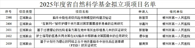 隨著《2025年度湖南省自然科學(xué)基金擬立項項目公示》于2月7日順利結(jié)束,我院護理團隊在科研領(lǐng)域傳來了振奮人心的消息。在湖南省科學(xué)技術(shù)廳公布的立項名單中,我院護理團隊共獲得科研項目立項5項,分別由陳麗萍、徐嘉玲、郭麗敏、譚華麗、曾滿萍獲得立項。這是我院護理人員繼2024年獲得1項省自然科研項目后取得的新突破。