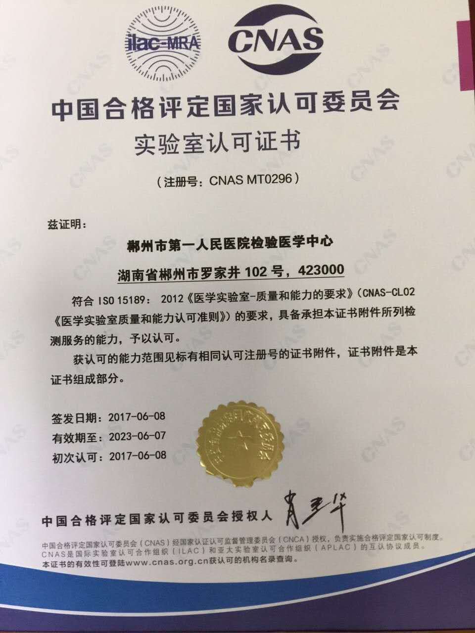?????? 郴州醫(yī)療質(zhì)量在醫(yī)療領(lǐng)域又一次大放光彩。6月8日,郴州市第一人民醫(yī)院正式發(fā)布,該院檢驗醫(yī)學中心順利通過中國合格評定國家認可委員會(CNAS)的檢驗醫(yī)學國際標準ISO15189評審,并領(lǐng)取到CNAS簽發(fā)認可證書,醫(yī)院成為湖南省地級市首家ISO15189實驗室認可的三級甲等醫(yī)院。