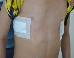 過去,治療漏斗胸是在患兒的前胸縱行或橫行切開皮膚,切口長約15厘米,將兩側(cè)胸肌分離開,切除兩側(cè)部分肋軟骨,再用鋼針固定。手術(shù)創(chuàng)傷大,出血多(300-400毫升),手術(shù)時間長(約3.5-4小時),手術(shù)恢復(fù)慢。2010年以來,郴州市第一人民醫(yī)院南院腫瘤外科一區(qū)(住院部8樓)治療漏斗胸便采用國際上最先進的“微創(chuàng)漏斗胸矯形術(shù)”即NUSS手術(shù)。該手術(shù)在胸腔鏡輔助下完成,在兩側(cè)胸壁各行一2厘米左右的微創(chuàng)切口便可完成手術(shù),創(chuàng)傷小,出血少,手術(shù)時間短,術(shù)后恢復(fù)快(4-5天即可出院)。術(shù)后矯形效果立竿見影、患者放心,家屬滿意。