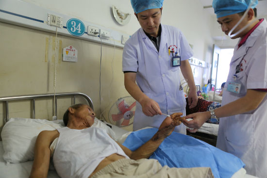 “感謝你把我父親從毒王‘五步蛇’口中挽救生命。”8月11日,永州市寧遠(yuǎn)縣石家洞鎮(zhèn)村民唐某緊握著郴州市第一人民醫(yī)院燒傷整形外科主任許喜生說感激道。 原來今年7月10日,唐某父親唐某斌到山林勞作時左手不慎被一條2公斤左右的五步蛇咬傷,咬傷后流血不止,送至當(dāng)?shù)蒯t(yī)院注射蛇毒血清后,當(dāng)?shù)蒯t(yī)院建議其戒肢。為了保住左手不截肢,次日,唐某斌趕到郴州市第一人民醫(yī)院燒傷整形外科找到許喜生主任和馬錚錚副主任醫(yī)師。 得知唐某斌病情后,許喜生團(tuán)隊(duì)決定對其采用國際領(lǐng)先的擴(kuò)創(chuàng)、背闊肌皮瓣游離移植術(shù)。許喜省介紹,針對唐某斌的手術(shù)主要分為兩個部分:一部分是皮瓣,另一部分則是植皮。早前,醫(yī)院已經(jīng)為他進(jìn)行了一次清創(chuàng)手術(shù),目的是為這第二部分手術(shù)做準(zhǔn)備。 “唐某斌左手損傷面積大,導(dǎo)致修護(hù)的難度增大,如果單純依靠植皮是無法完全修復(fù)的。”許喜生表示,皮瓣移植是為他的整個治療過程打好基礎(chǔ)。如果把整個治療過程比作種花,皮瓣移植就是鋪上一層肥沃的土壤,那么后期的植皮等工作則會相對容易很多。 “手術(shù)的設(shè)計(jì)、切取、移植是最大的難點(diǎn)?!霸S喜生介紹道,由于唐某斌已經(jīng)有63歲高齡了,其血管較細(xì),解剖血管難度較大,而且我們必須保證血管完全通暢、吻合,不能出現(xiàn)一點(diǎn)差錯。這就要求我們必須做到100%精確,以降低對患者的損傷程度。 當(dāng)天,手術(shù)一直持續(xù)了8個小時方才結(jié)束?!疤颇潮蟮膿p傷情況確實(shí)比較嚴(yán)重,但是完全恢復(fù)是有很大希望的。”許喜生表示。 據(jù)許喜生介紹,五步蛇是我國常見的劇毒蛇之一,近幾年來發(fā)病率呈上升趨勢,蛇毒屬血循毒素,成分十分復(fù)雜,主要包括酶和非酶多肽毒素,被其咬傷后患者除有全身中毒癥狀外,常導(dǎo)致組織的廣泛出血、滲出、水腫, 甚至壞死、肌肉溶解等,嚴(yán)重者可致蛇傷筋膜間隔綜合征,創(chuàng)面遷延不愈,治療上極為棘手,嚴(yán)重影響患肢功能,導(dǎo)致患者生活質(zhì)量下降。 許喜生正在為查看術(shù)后康復(fù)情況 醫(yī)生提醒 部分“土辦法”不可信 蛇咬后應(yīng)趕緊送醫(yī) “夏秋是蛇類出沒的多發(fā)季,7月份開始,我們科每天收治的蛇傷患者有兩三人,幾乎每天夜里都有被毒蛇毒蟲咬傷的患者前來就診?!痹S喜生稱悶熱的天氣,毒蛇活動會較為頻繁,一般情況下,草叢、石縫、溪畔等處是蛇類喜歡棲息的地方,市民外出踏青,干農(nóng)活,經(jīng)過這些地方時應(yīng)特別注意。 被毒蛇咬傷后,應(yīng)立即用柔軟的繩或布條結(jié)扎在傷口上方,每隔一段時間松綁一次,最好能擠出毒液,防止毒素?cái)U(kuò)散。同時,應(yīng)立即用冷茶、冷開水或泉水沖洗傷口,有條件的話可用生理鹽水、肥皂水。 對于喝茶油防止蛇毒攻心的“土辦法”,許喜生稱“根本沒有科學(xué)依據(jù),被蛇咬傷后要及時送往配備有多種毒蛇血清的醫(yī)院進(jìn)行治療”。如果咬傷傷口較大,可以到郴州市第一人民醫(yī)院實(shí)施擴(kuò)創(chuàng)、背闊肌皮瓣游離移植術(shù)。  |