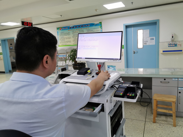 當(dāng)日上午8:00時(shí),住院收費(fèi)室的工作人員推著一輛白色的方形小車,來到外科大樓19樓,??吭诟文懲饪谱o(hù)士站。陸續(xù)有當(dāng)日出院的患者家屬前來辦理出院手續(xù)。接過家屬手中的票據(jù)卡證,工作人員手腳麻利地在小推車上方操作一番,并標(biāo)注清楚需要再次來院進(jìn)行結(jié)算的時(shí)間?!昂昧耍@個(gè)可以了!”辦理完成,家屬道謝離開,前后還不到五分鐘。