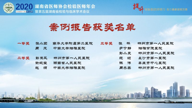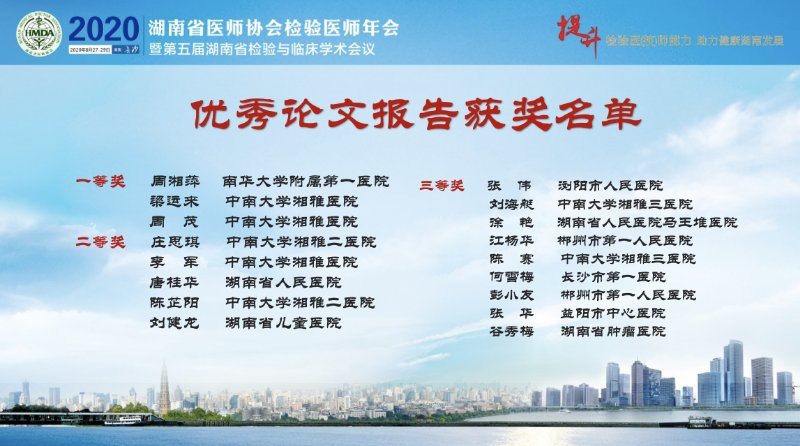 8月29日,為期三天的2020年湖南省醫(yī)師協(xié)會檢驗(yàn)醫(yī)師年會暨湖南省第五屆檢驗(yàn)與臨床高峰論壇在湖南長沙隆重閉幕,郴州市第一人民醫(yī)院檢驗(yàn)醫(yī)學(xué)中心在論文評比,優(yōu)秀案例評比中表現(xiàn)出色,我們團(tuán)隊(duì)論文及病例投稿20余篇,經(jīng)初賽和ppt講演決賽評比優(yōu)秀論文加病例獲獎(jiǎng)?wù)咭还参迦耍渲薪瓧钊A、彭小友獲得優(yōu)秀論文三等獎(jiǎng);彭玉鳳獲得優(yōu)秀病例二等獎(jiǎng);張林、彭小友、周杰英獲得優(yōu)秀病例三等獎(jiǎng);郴州市第一人民醫(yī)院郴州團(tuán)隊(duì)獲參會最佳組織獎(jiǎng)及最佳投稿獎(jiǎng)。