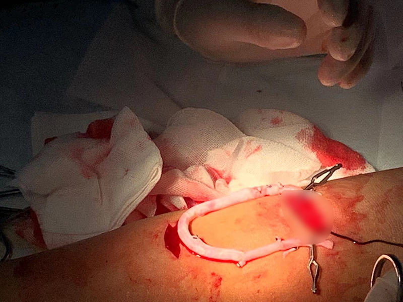 郴州市第一人民醫(yī)院血液凈化中心郭勝根主任團(tuán)隊(duì)一直在思考著這個(gè)問題,人的靜脈全身都有,上肢靜脈耗竭了,能否從自身其他地方取根血管來做搭橋,然后順利在上肢建立一個(gè)自體移植血管動(dòng)靜脈內(nèi)瘺呢?理論上是可取的,也有人取過尸體移植血管嘗試建立動(dòng)靜脈內(nèi)瘺,取得了成功。為此,郭勝根主任團(tuán)隊(duì)血管通路組的醫(yī)生經(jīng)過查閱資料,反復(fù)探索,充分討論后決定為一名特殊的自體血管耗竭患者老李(化名)采用這種新的手術(shù)方案。老李家住永州,是一名糖尿病腎病的患者,血管條件差,目前自體血管耗竭,無法建立常規(guī)的自體血管動(dòng)靜脈內(nèi)瘺,因家庭經(jīng)濟(jì)困難無法接受人工血管動(dòng)靜脈內(nèi)瘺成形術(shù),且害怕長期導(dǎo)管導(dǎo)致的感染并發(fā)癥(因?yàn)椴〕讨欣侠钜呀?jīng)出現(xiàn)過幾次嚴(yán)重的感染,差點(diǎn)喪命)。術(shù)前郭勝根主任親自與患者進(jìn)行充分的術(shù)前談話,老李決定接受這種新的手術(shù)方式并簽字授權(quán)。郭勝根主任召集科室全體血管通路醫(yī)生進(jìn)行了充分的術(shù)前討論,對術(shù)前、術(shù)中、術(shù)后可能出現(xiàn)的意外情況及并發(fā)癥設(shè)計(jì)了各種應(yīng)急處置預(yù)案。討論后郭勝根主任指示主刀醫(yī)生張堅(jiān)副主任醫(yī)師一定要注意細(xì)節(jié),確保手術(shù)成功。