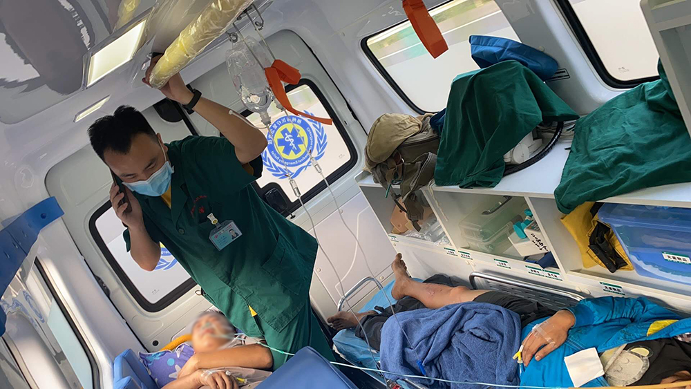 到達現(xiàn)場后,發(fā)現(xiàn)兩名患者傷勢嚴(yán)重,1名傷者小腿骨折并昏睡狀態(tài),另外1名傷者捂著肚子不停地喊痛,李強醫(yī)生憑經(jīng)驗肯定的和宋建兵護士說道:“這個喊叫的病人很有可能脾破裂,必須趕快給他開通靜脈補液。”宋建兵護士連忙迅速建立起了通道。