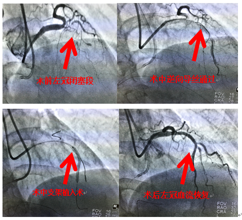 該患者為老年女性患者,因胸痛入住南院老年心血管內(nèi)科,冠狀動(dòng)脈造影確診左側(cè)冠狀動(dòng)脈(前降支)近端開(kāi)始就完全閉塞,右側(cè)冠狀動(dòng)脈形成側(cè)枝供應(yīng)左側(cè)前降支遠(yuǎn)端,但是自身遠(yuǎn)端也存在嚴(yán)重狹窄。老年心血管李維軍科主任立即組織老年心血管介入團(tuán)隊(duì)進(jìn)行討論后決定先行左側(cè)冠脈支架植入術(shù),嘗試正向cto技術(shù),如通過(guò)困難則行逆向cto技術(shù)。該患者最終使用逆向cto技術(shù)順利完成左側(cè)冠狀動(dòng)脈支架植入術(shù),并術(shù)后未出現(xiàn)并發(fā)癥。手術(shù)術(shù)者李維軍科主任,助手周玉慶主治醫(yī)師。