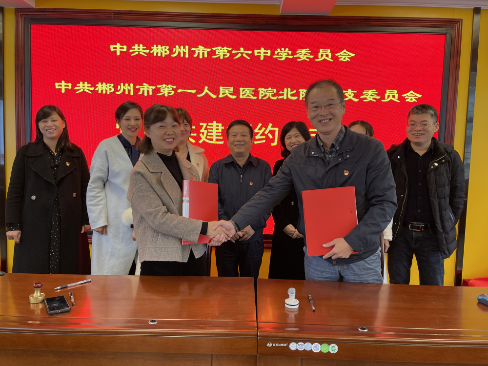11月16日,中共郴州市第一人民醫(yī)院北院總支委員會(huì)與中共郴州市第六中委員會(huì)合作共建簽約儀式在郴州市第六中學(xué)黨員活動(dòng)中心隆重舉行。在雙方支部代表們的共同見證下,郴州市第一人民醫(yī)院北院執(zhí)行院長(zhǎng)彭麗秀、黨總支副書記連一民與郴州市第六中學(xué)校長(zhǎng)夏立新、校黨委書記羅柳莉鄭重簽署了雙方的共建協(xié)議。雙方以支部共建為抓手,通過黨建共建,探索和實(shí)施跨部門合作新模式,為學(xué)生健康助力,為建黨100周年獻(xiàn)禮。