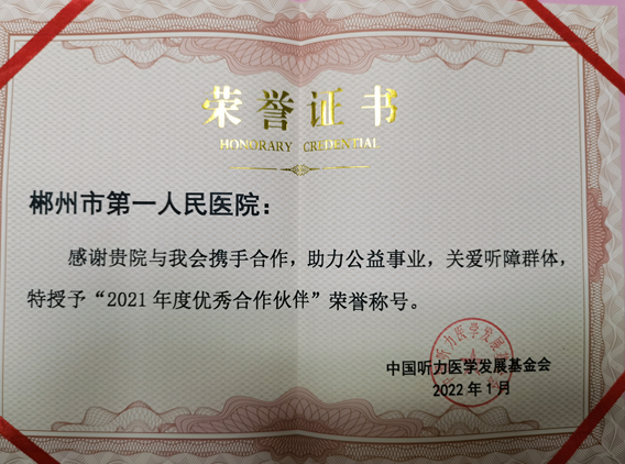 近日,中國(guó)聽(tīng)力醫(yī)學(xué)發(fā)展基金會(huì)授予郴州市第一人民醫(yī)院“2021年度優(yōu)秀合作伙伴”榮譽(yù)稱號(hào),充分肯定了該院在過(guò)去的一年,同基金會(huì)共同開(kāi)展的關(guān)愛(ài)聽(tīng)障群體公益項(xiàng)目中所取得的成效。