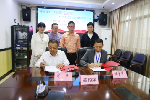 儀式上,郴州市第一人民醫(yī)院院長方力與臺州市博寶醫(yī)療器械有限公司總經(jīng)理程官軍簽訂轉(zhuǎn)化協(xié)議。