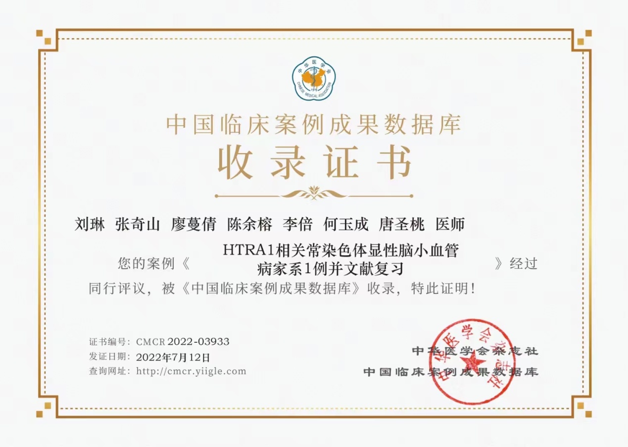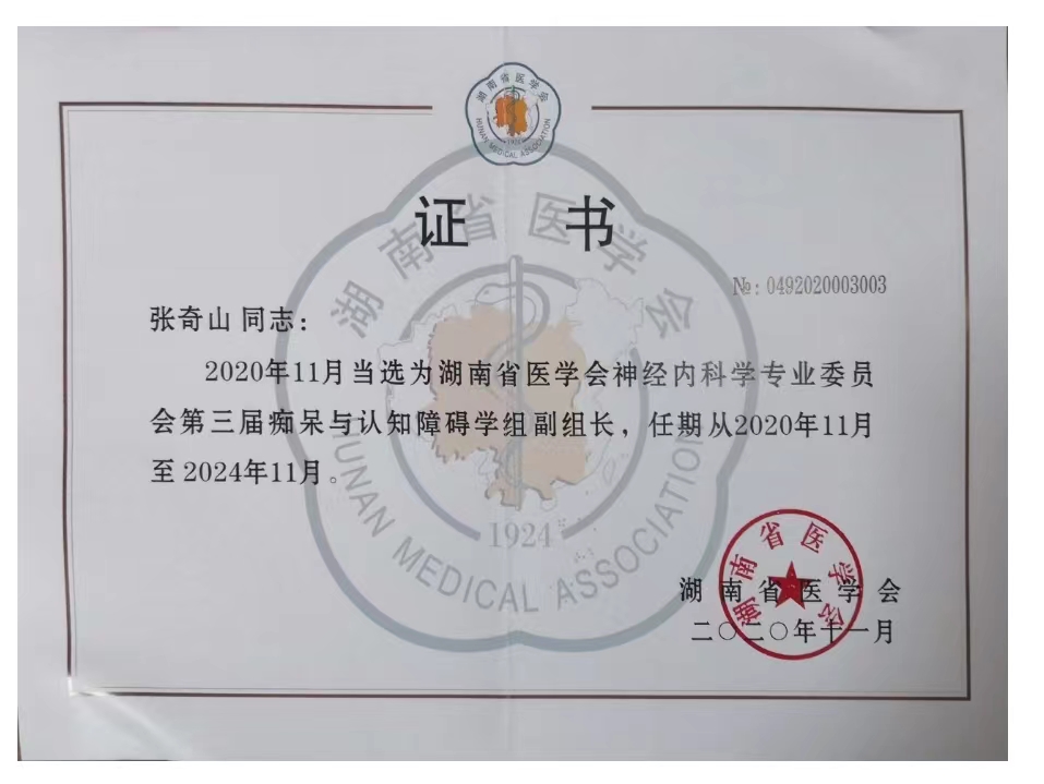 此次國家高級認知障礙診療中心獲批,是我院神經(jīng)內(nèi)科繼國家高級卒中中心之后,獲批的第二個國家級診療中心。神經(jīng)內(nèi)科癡呆與認知障礙亞專業(yè)設在神經(jīng)內(nèi)科5區(qū)(2號樓11樓),多年來一直推進老年認知障礙的規(guī)范化診療。目前,認知障礙亞專業(yè)設有記憶與認知障礙??崎T診,認知功能測評與訓練中心(門診樓323診室),認知障礙亞??撇》浚▽?拼参?/span>18張),能夠為癡呆與認知障礙患者提供認知測評、病因診斷、藥物治療,及認知康復等規(guī)范化診療??剖遗c湘雅醫(yī)院神經(jīng)內(nèi)科開展合作,建立了社區(qū)老年人認知障礙隨訪隊列,以及臨床隊列,其中碩士研究生的相關科研成果已經(jīng)陸續(xù)發(fā)表在國內(nèi)專業(yè)期刊上,其中一個家系研究被“中國臨床案例成果數(shù)據(jù)庫”收錄。2020年,張奇山被評為湖南省醫(yī)學會神經(jīng)內(nèi)科專業(yè)委員會癡呆與認知障礙學組副組長。