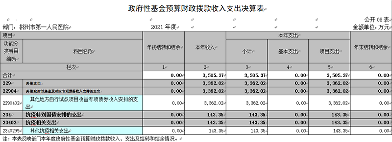2021年度政府性基金預算財政撥款收入3,505.37萬元;年初結(jié)轉(zhuǎn)和結(jié)余0萬元;支出3,505.37萬元,其中基本支出0萬元,項目支出3,505.37萬元;年末結(jié)轉(zhuǎn)和結(jié)余0萬元。