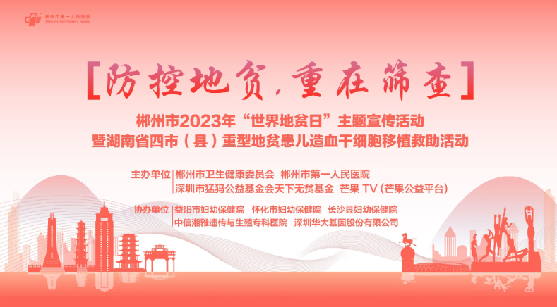 5月8日,郴州市2023年“世界地貧日”主題宣傳活動(dòng)暨湖南省四市(縣)重型地貧患兒造血干細(xì)胞移植救助活動(dòng)在郴州市第一人民醫(yī)院?jiǎn)?dòng)。郴州市副市長(zhǎng)彭生智、市衛(wèi)生健康委黨委書記曾忠良出席,郴州市第一人民醫(yī)院黨委書記雷冬竹主持,益陽市婦幼保健院、懷化市婦幼保健院、長(zhǎng)沙縣婦幼保健院、中信湘雅生殖與遺傳??漆t(yī)院主要負(fù)責(zé)人,郴州市11個(gè)縣(市)區(qū)婦幼保健院院長(zhǎng),華大基因等愛心企業(yè)及愛心人士代表,部分地貧患兒及家長(zhǎng)約200人參加。