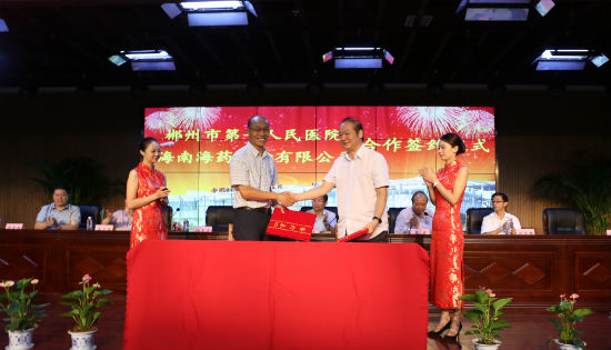 郴州市第一人民醫(yī)院院長黃仁彬(右)、海南海藥股份有限責(zé)任公司總經(jīng)理任榮(左)在合作協(xié)議上簽字