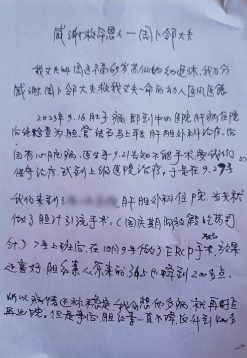 周遠(yuǎn)福的老伴卻沒有忘記。當(dāng)丈夫被送郴州市第一人民醫(yī)院中心醫(yī)院,因搶救及時(shí)脫離了生命危險(xiǎn)后,她手寫了一封感謝信送給周卜鄰:“沒有周大夫的熱心幫助,真不敢想象后果會(huì)怎么樣。因此我萬分感謝周大夫,深為郴州有位這么醫(yī)德高尚的醫(yī)生感到驕傲……”