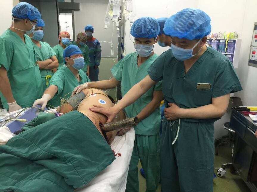 據(jù)普外科主任張建文博士介紹,患者被送來時(shí)的情況特別緊急,手指粗的鋼筋插入腹內(nèi)大約40厘米深,很可能傷及大腸、神經(jīng)等重要臟器。張建文博士立即組織了普外科、肝膽外科、泌尿外科、麻醉科共12位醫(yī)療專家會(huì)診。